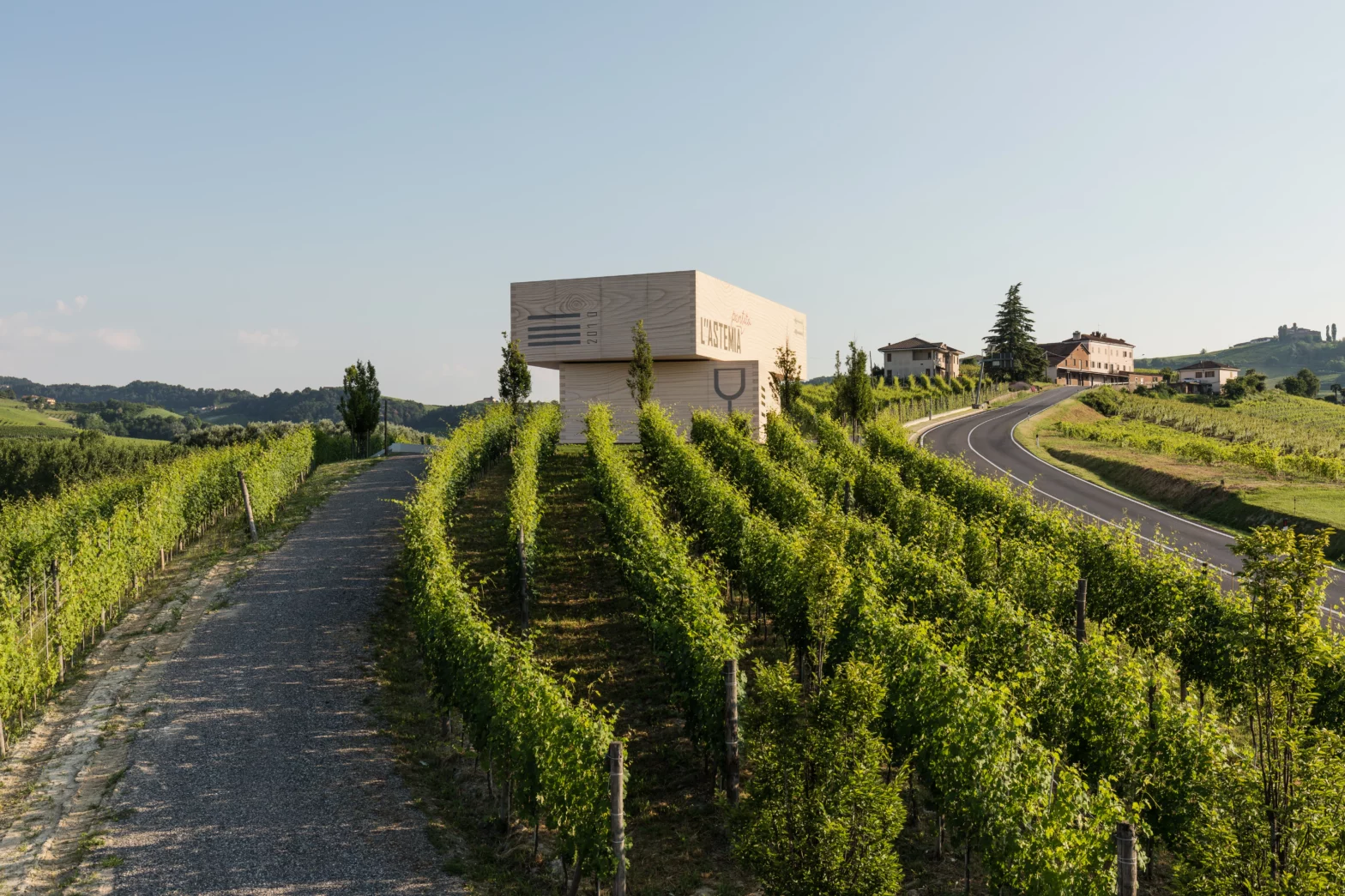 La cantina L’’Astemia pentita, progettata da Gianni Arnaudo, si distingue per un linguaggio architettonico ironico e simbolico. L’edificio, concepito come due grandi cassette di vino disassate e fuori scala, trasforma l’oggetto quotidiano della commercializzazione nell’icona stessa del processo produttivo. Collocata sulle colline di Barolo, la struttura emerge con forza comunicativa nel paesaggio ed esprime le tensioni tra produzione e commercializzazione, tradizione e innovazione, monumentalità e quotidianità. Due piani fuori terra ospitano gli spazi di accoglienza e rappresentanza, mentre la produzione è interamente collocata nei livelli interrati. Ironia e contraddizione guidano la narrazione: una cantina che si presenta come “astemia” ma “pentita”, celebrando la complessità del vino senza rinunciare a una vena dissacrante.