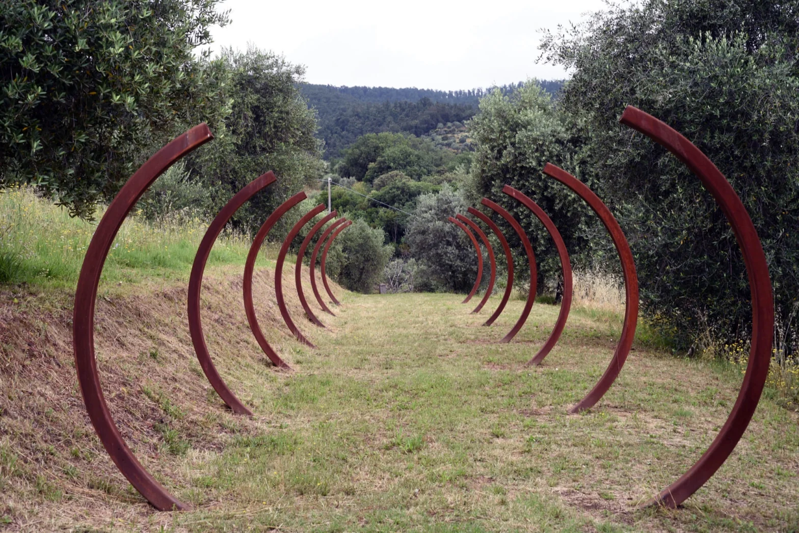 L’artista turca studia una porzione di spazio aperto nella zona degli uliveti, realizzando poi un’installazione immersiva e potente, che gioca fra lo spazio reale e l’immaginazione. Büyüktaşçıyan inserisce dei pali curvi, in acciaio corten, nel terreno. Ne pone uno di fronte all’altro, formando idealmente un arco, e ripete l’atto per altre sei volte, trovandosi così a costruire una sorta di tunnel all’aperto con sette archi (quattordici pali). Camminando nel Parco, ci si confronta con un’installazione che richiama fortemente un reperto paleontologico, come se si trattasse di una carcassa animale gigantesca, entro la quale siamo invitati a camminare.