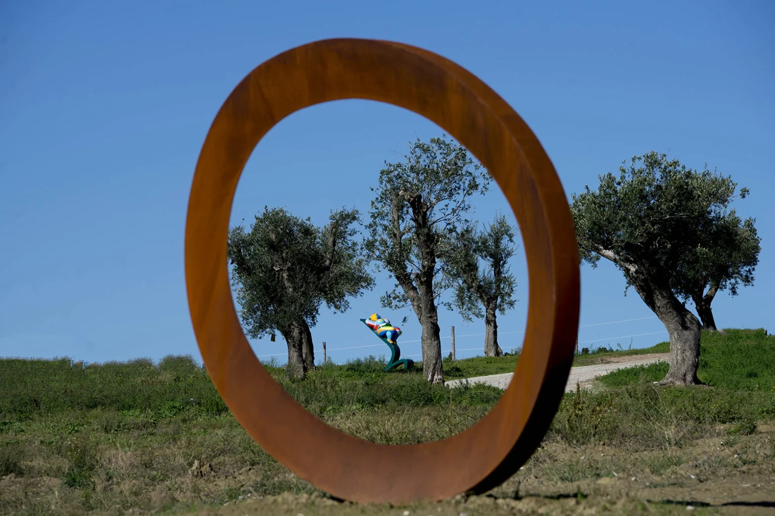 Ellisse è una scultura che si staglia sui filari di Tenuta Mara, esprimendo la poetica geometrica e minimale dell’artista. La forma ellittica, armonicamente integrata nel paesaggio, guida lo sguardo in un moto rotatorio che, con la sua forza ancestrale e il purismo geometrico, configura  una presenza intensa e meditativa, dialogando con il territorio e con l’esperienza sensoriale dello spettatore.