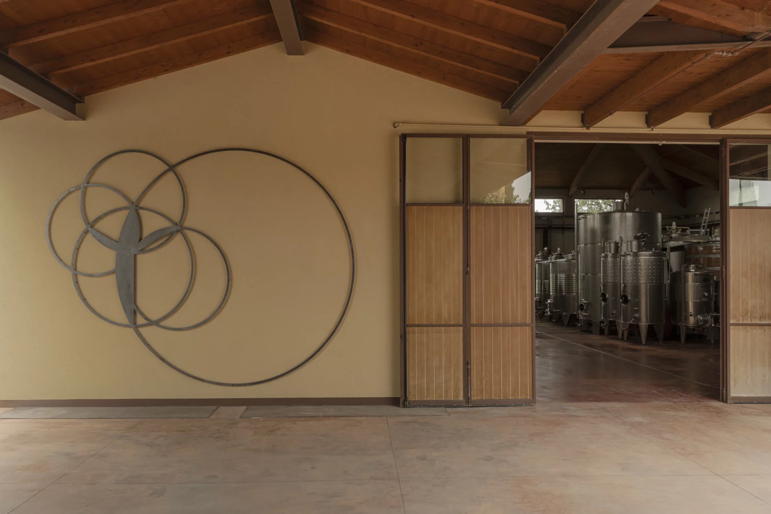 Germoglio di Remo Salvadori, presentata per la mostra Terre Rare (2024) e oggi in esposizione permanente, accompagna il visitatore tra gli spazi esterni e il cuore della cantina. L’opera si compone di due interventi che segnano l’inizio e la conclusione del percorso di visita. Sulla parete esterna, cinque cerchi intrecciati, ciascuno originato da un centro diverso, danno vita alla figura del germoglio, una figura che unisce la forma circolare con cui l’artista sperimenta fin dagli anni Ottanta, e i concetti di relazione e ciclo vitale. All’interno della cella frigorifera, la seconda parte, realizzata con materiali conduttivi, completa il ciclo espositivo, evocando il flusso di energia e trasformazione che attraversa la terra e accompagna ogni fase della vinificazione.