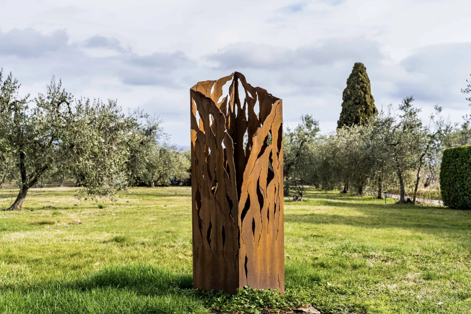 Iron and Fire si configura come un tripudio della materia e della sua trasformazione. La scultura è costituita da una colonna quadrangolare vuota, costituita da una superficie, in corten, segnata da alcune lacerazioni, come se fosse appena stata bruciata. Paolo Fusi evoca la forza primordiale degli elementi e connota la colonna di significati spirituali. Si tratta sostanzialmente di un totem aperto che crea interazione fra la terra e il cielo.