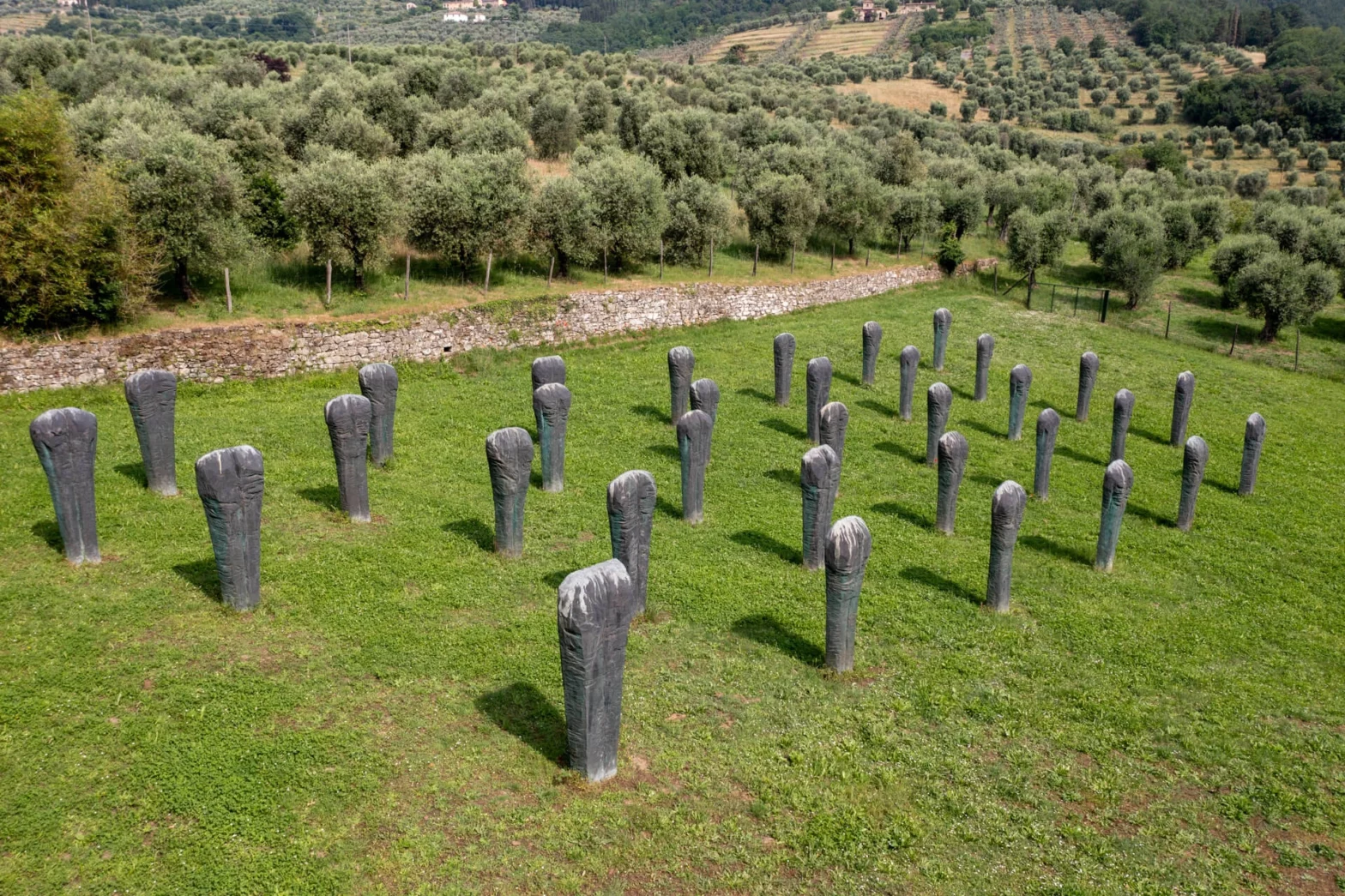 Trentatré figure in bronzo sono disposte allineate come un esercito in riga in una porzione di terra al confine del Parco, recintata da filo spinato. Tra di loro le figure si assomigliano, da dietro sono tutte omogenee mentre da davanti si tratta di sei modelli privi di testa e braccia, ripetuti serialmente. Per l’artista polacca Magdalena Abakanowicz si tratta del primo lavoro in bronzo che, grazie alla ripresa di forme e modelli della statuaria egizia o di figure totemico-rituali, incide fortemente sulla psicologia dello spettatore.