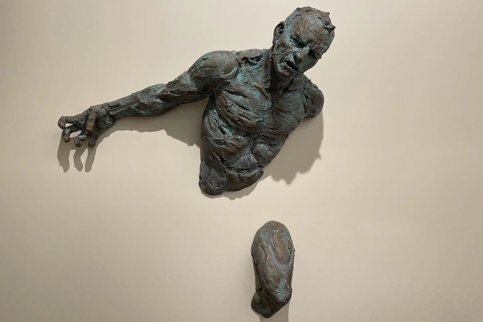 Kriya appartiene alla serie Extra Moenia di Matteo Pugliese, dedicata a figure che sembrano travalicare i limiti della materia per affermare la propria presenza. L’opera raffigura un corpo che emerge dalla parete con tensione e sofferenza, in un gesto di potente liberazione. Il titolo, dal sanscrito kriyā (azione), sintetizza il significato profondo dell’opera: l’energia vitale del fare come atto di resistenza e rinascita.
