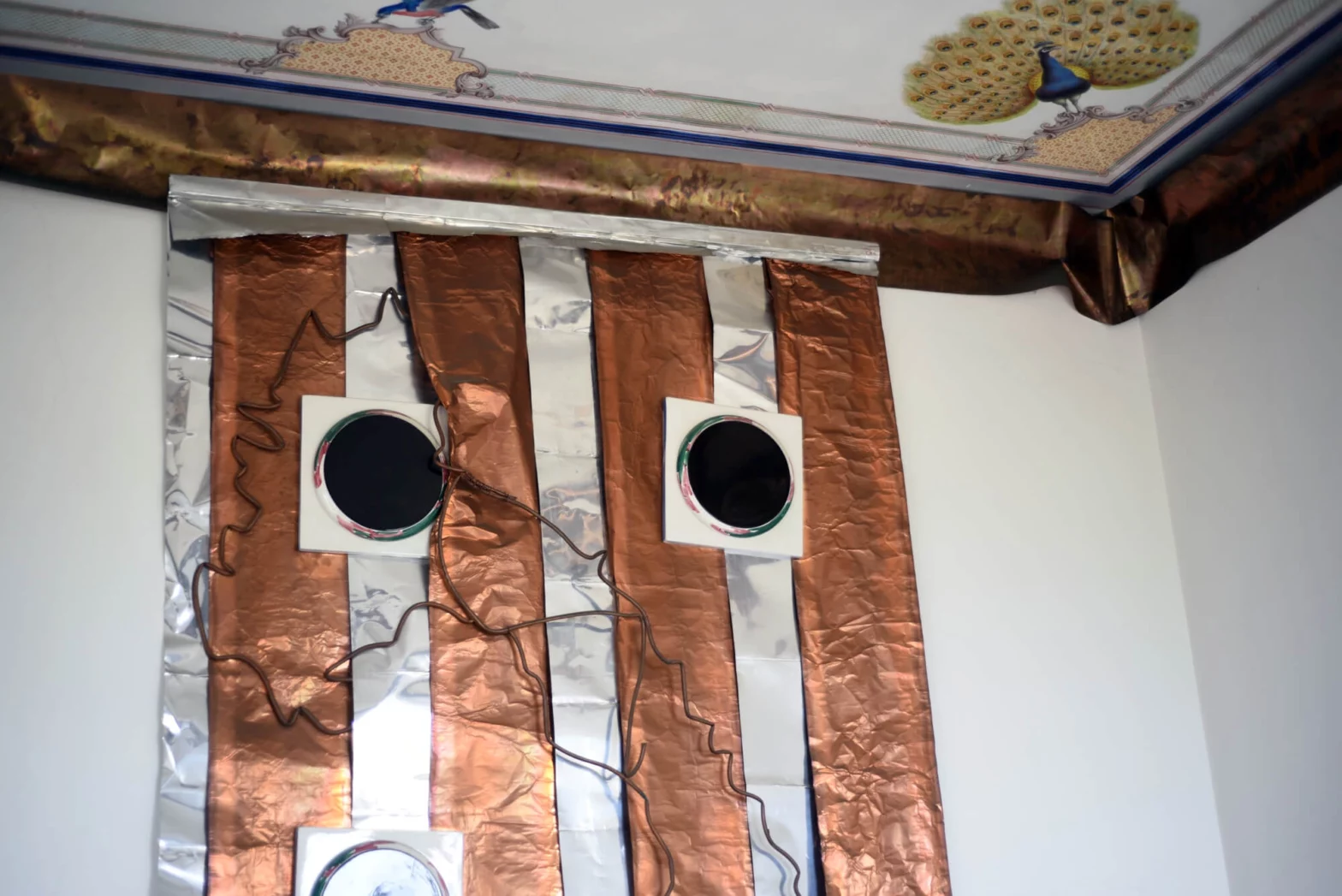 Uno dei primi interventi realizzati per la Fattoria di Celle è quello di Luciano Fabro, invitato a lavorare in una delle stanze dei vecchi appartamenti nobiliari. L’artista ha scelto di intervenire partendo da una fascia di rame che corre lungo il perimetro superiore delle quattro pareti, tracciando una linea di confine tra la sua opera e il soffitto affrescato con motivi orientali. Al di sotto di questa fascia, Fabro colloca un pannello composto da strisce alternate di stagno e rame, sul quale poggia un’Italia rovesciata orizzontalmente, modellata con un tubo di rame. Sopra il pannello si trovano inoltre tre quadrati di ceramica bianca con cerchi neri dipinti, caratterizzati da tracce di rosso e verde, uno disposto sopra la penisola mentre gli altri due ai lati, forse evocazioni simboliche delle isole.