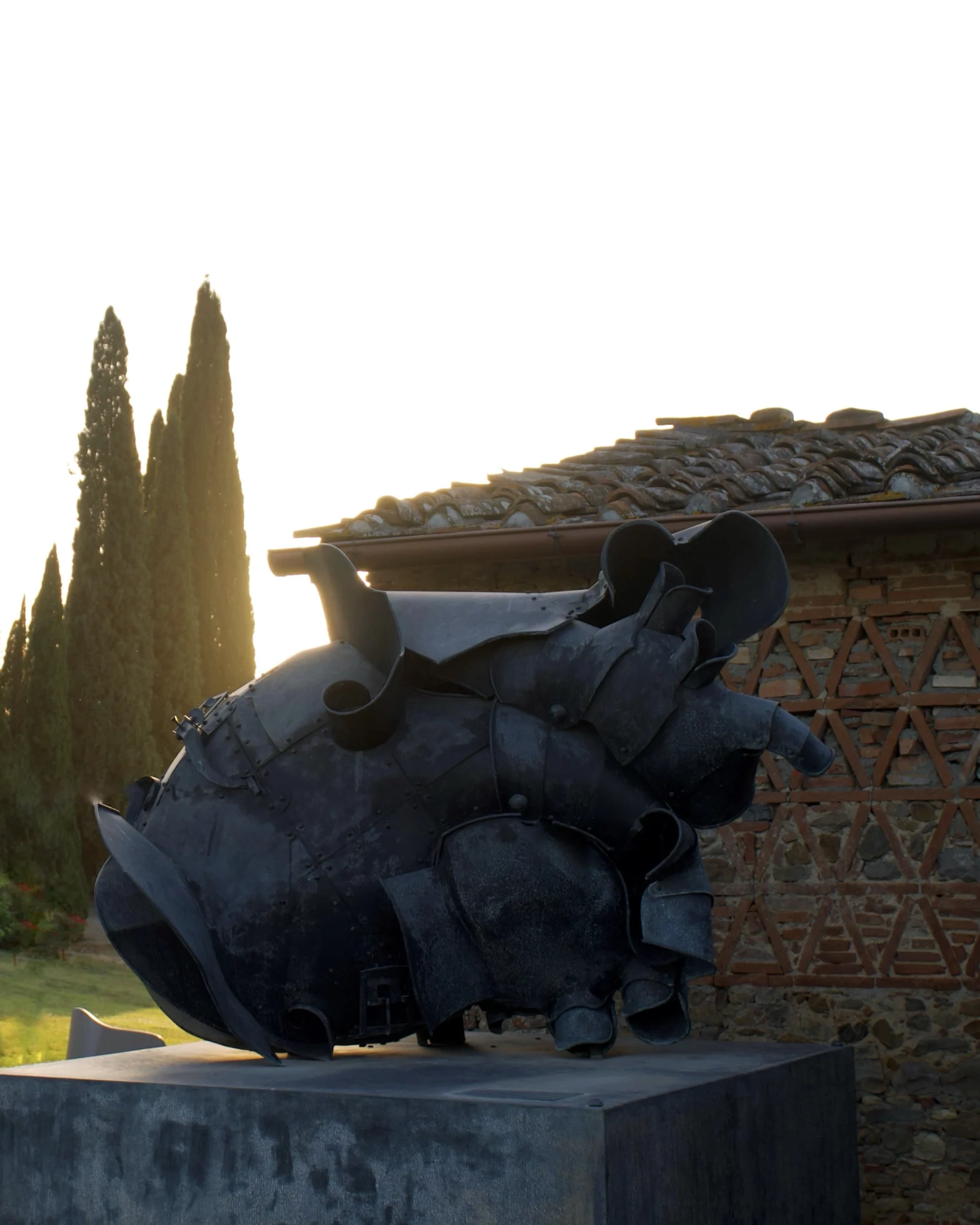 Come anticipa il titolo Safety Heart Armour, l’opera si presenta come un grande cuore anatomico in bronzo, interamente rivestito da un’armatura tagliente costituita da lamine e ingranaggi, che esaltano la tensione tra vulnerabilità e difesa. Questo cuore, simbolo vitale della terra, si protegge dalle minacce dell’uomo, trasformando la paura in protezione. L’artista invita alla riflessione sul rapporto tra umanità e natura, invitando lo spettatore a ristabilire un contatto con la terra in un atto di cura.