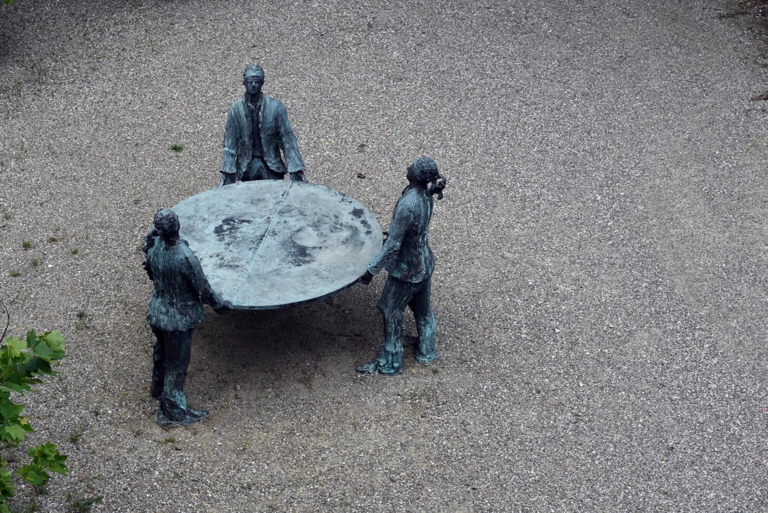L’opera, disposta all’ingresso del Parco tra Fattoria e Villa, si configura come una metafora dell’esistenza umana. Qui, all’ombra di un platano, tre figure maschili sorreggono una tavola rotonda sulla quale è inciso un disegno a rilievo. Si tratta di una cornucopia dalla cui abbondanza fuoriesce una città inghiottita da un pesce dalle sembianze mostruose. La condizione umana è imprevedibile e dominata dal destino. Gli uomini, infatti, che reggono il peso dell’esistenza, sono bendati, alimentando il senso di incertezza.